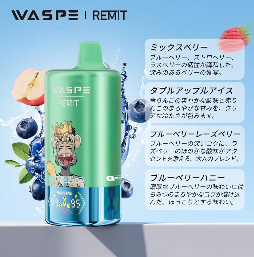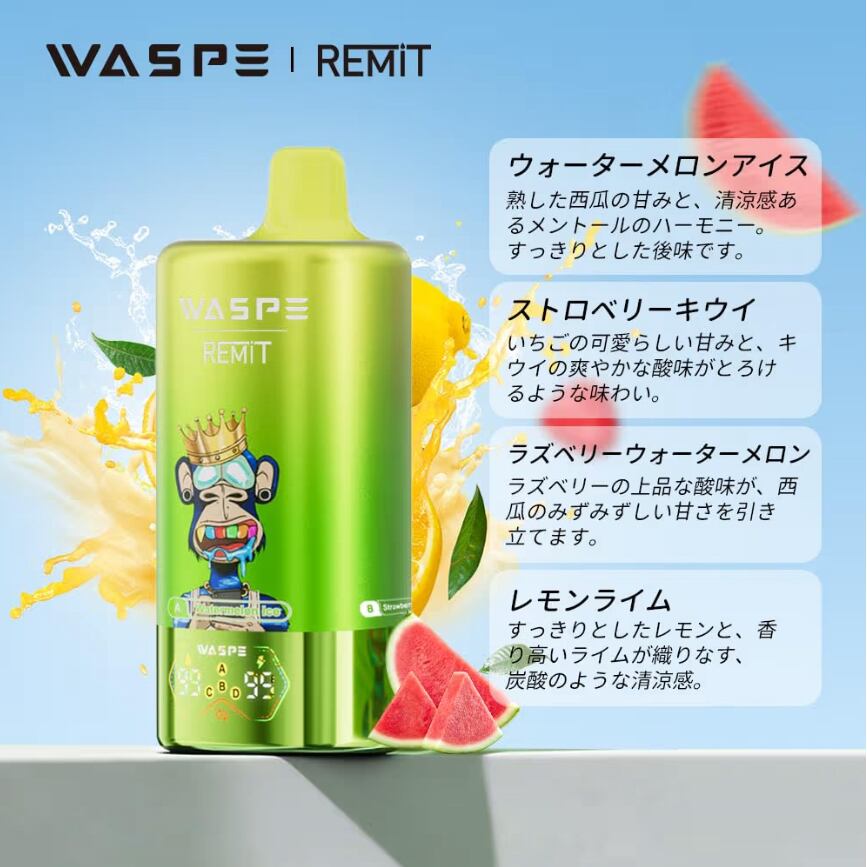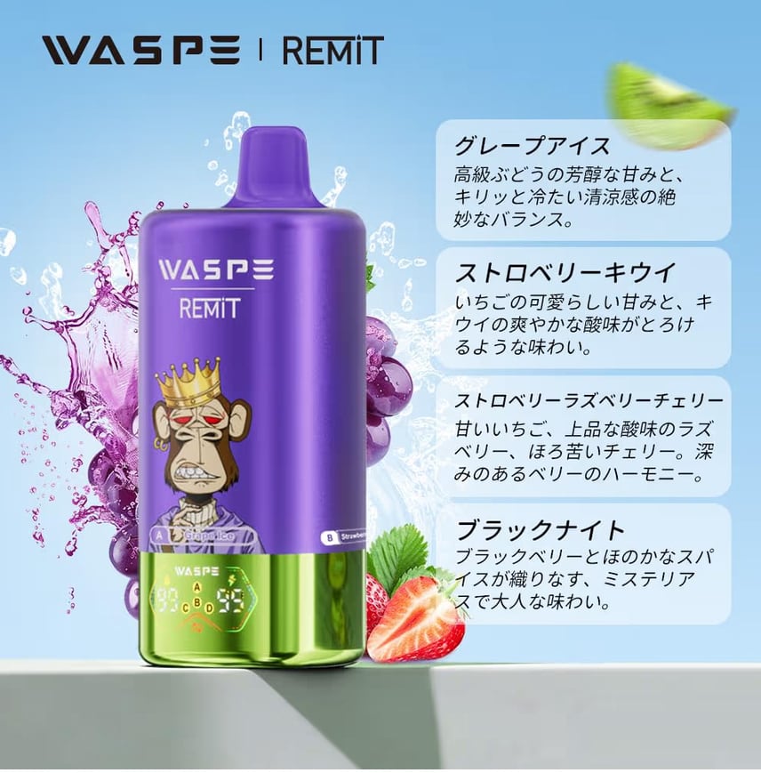 WASPE REMIT 100,000 Puffsは100,000回の吸引が可能で、長持ちする使用感と毎回の吸引で一貫した満足感を提供します。4種類のフレーバーポッドが付属しているので、1台のベイプデバイスでいつでも4種類のフレーバーを楽しむことができます。WASPE REMIT 100000 Puffsは、1.0オームのメッシュコイルをデュアルで備えており、スムーズで風味豊かな蒸気を発生させ、豊かな風味と満足のいく喉越しを実現します。56mLのeリキッド容量で長時間のベイピングセッションが可能になり、650mAhの充電式バッテリーは長時間の使用に十分な電力を供給します。Type-C急速充電で、充電は迅速かつ簡単です。スマートLEDディスプレイは、バッテリー残量とeリキッドレベルを即座に更新するため、デバイスの状態を常に把握できます。4種類フレーバーエクスペリエンス機能により、4種類のフレーバーを切り替えて、無限の可能性を秘めた自分だけのベイピング体験をお楽しみいただけます。
